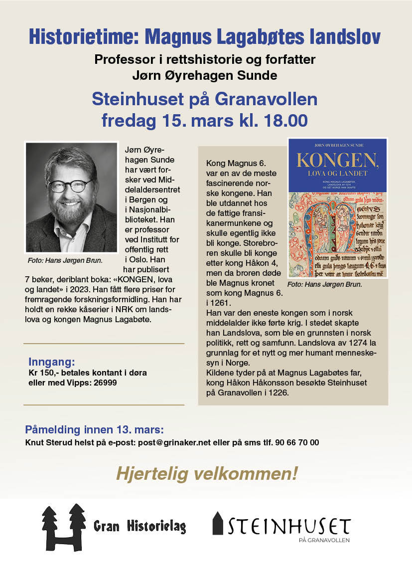 Spennende foredrag om "Magnus Lagabøtes Landslov" Spennende foredrag om "Magnus Lagabøtes landslov" i Steinhuset fredag 15 mars kl 18.00 Vi får besøk av en svært god formidler: Professor i rettshistorie og forfatter, Jørn Øyrehagen Sunde. Begrenset antall plasser, så vær rask.