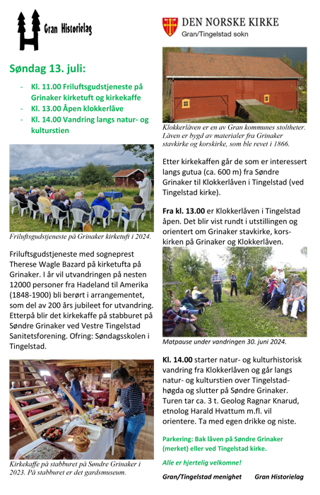 Søndag 13. april er det friluftsgudstjeneste på kirketuftene på Grinaker kl. 11.00 med etterfølgende kirkekaffe. Kl. 13.00 åpner klokkerlåven, og de som vil kan bli med på vandring langs natur- og kulturstien fra kl. 14.00.